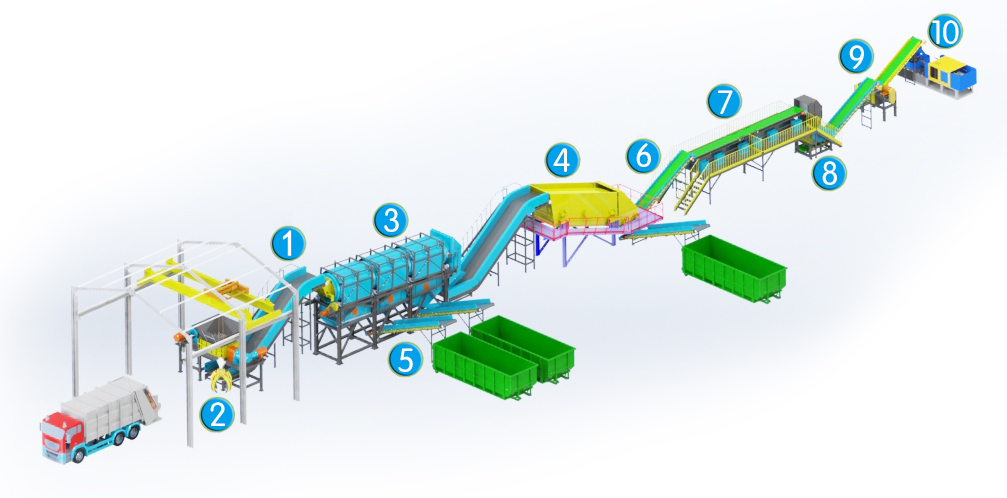 生活垃圾成分復(fù)雜多變,可回收價(jià)值組分各不相同,環(huán)創(chuàng)生活垃圾分選+RDF線的主要作用是將生活垃圾分選出紙張,塑料,鐵,鋁等有回收價(jià)值的廢料后,將剩下的可燃物粉碎為RDF為汽化發(fā)電廠或水泥廠提供再生燃料。